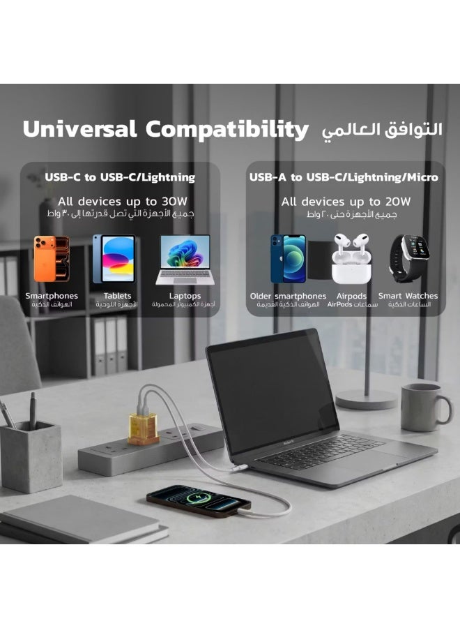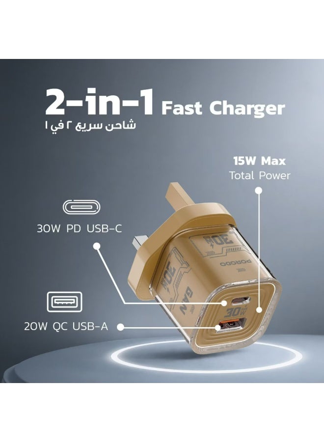 يجمع شاحن الحائط السريع Porodo TEZCLARTÉ باللون الأسود بين الشحن القوي عالي السرعة والتصميم الأنيق والمدمج. يوفر منفذ USB-C طاقة قصوى تصل إلى 30 واط، مما يتيح شحنًا سريعًا للهواتف الحديثة والأجهزة اللوحية، وحتى بعض أجهزة الكمبيوتر المحمولة الصغيرة. بفضل منفذي USB-C وUSB-A، يمكنك شحن جهازين في وقت واحد بكل سهولة. صُمم هذا الشاحن خصيصًا للسفر، ويتميز بنطاق جهد عالمي (100-240 فولت) للاستخدام الآمن في جميع أنحاء العالم، بينما يضفي تصميمه الشفاف والمستقبلي لمسة عصرية. يضمن غلافه المقاوم للاشتعال أمانًا مدمجًا، كما أن وزنه الخفيف وحجمه الصغير (65 غرامًا) يجعله الرفيق الأمثل لشحن سريع وموثوق أثناء التنقل.